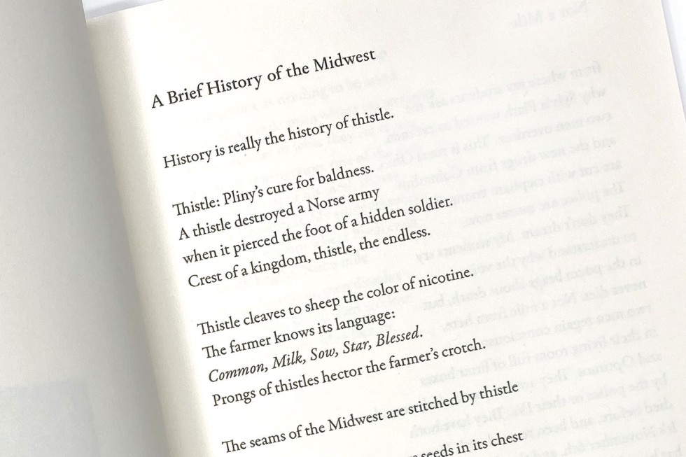 Thistle grows all over the fields and ditches of Knox County, where I live. Yet it has held cultural and even medicinal significance for centuries, from Pliny to the Vikings to ancient Scottish iconography. Today in agriculture, thistle is categorized as a weed and is sprayed with herbicides in an attempt to eradicate it. But weeds are adaptable and prolific and they find ways to endure and even thrive, outwitting newfangled chemical strategies that have deemed them undesirable. Many human lives are lived this way. In “A Brief History of the Midwest” (Black Lawrence Press, 2025), my hope was that, by making the first line of the first poem — which is also the title poem — give primacy to thistle and argue that one can understand history through its lens, I would be centering something marginalized and showing its power.